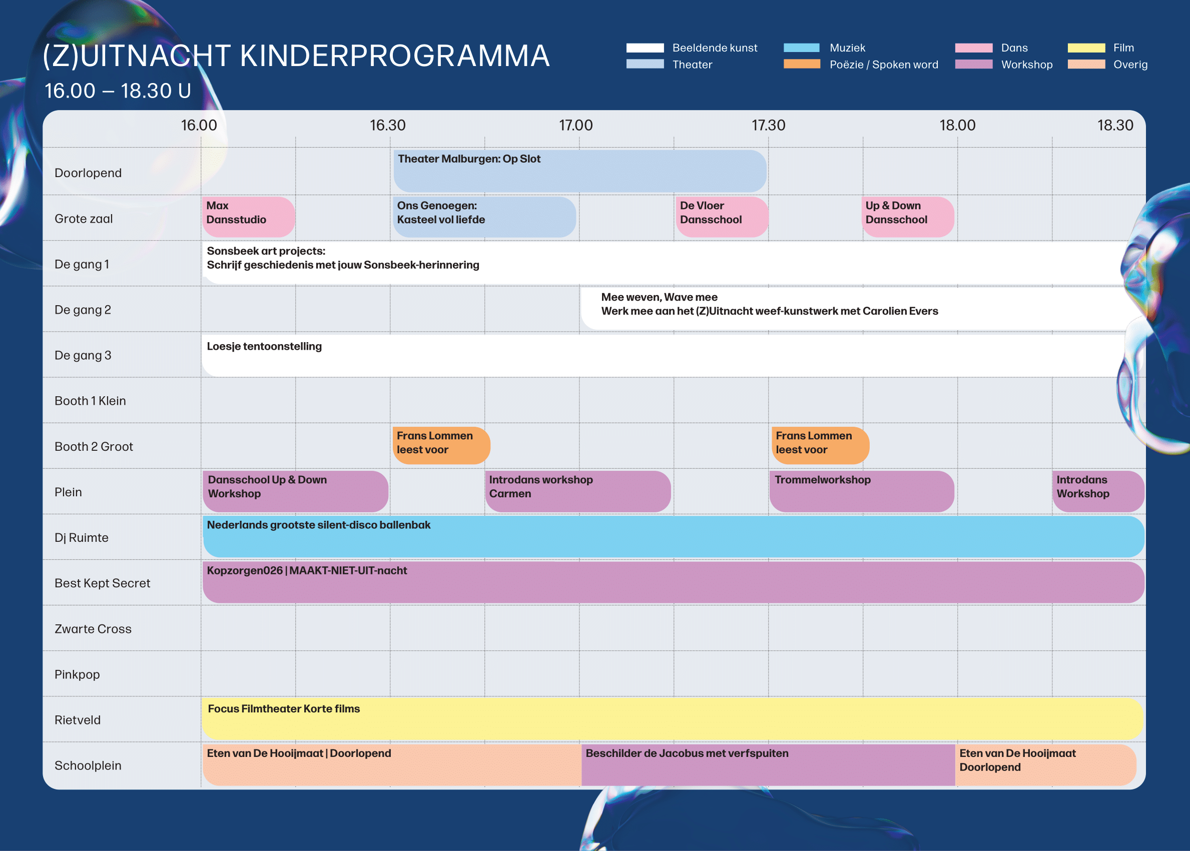 Tijdens de (Z)Uitnacht ontdek je een doorlopend programma van voorstellingen, installaties en ontmoetingen op één plek. Met het blokkenschema zie je in één oogopslag wat er wanneer te beleven is, zodat je eenvoudig je eigen programma kunt samenstellen en niets hoeft te missen.