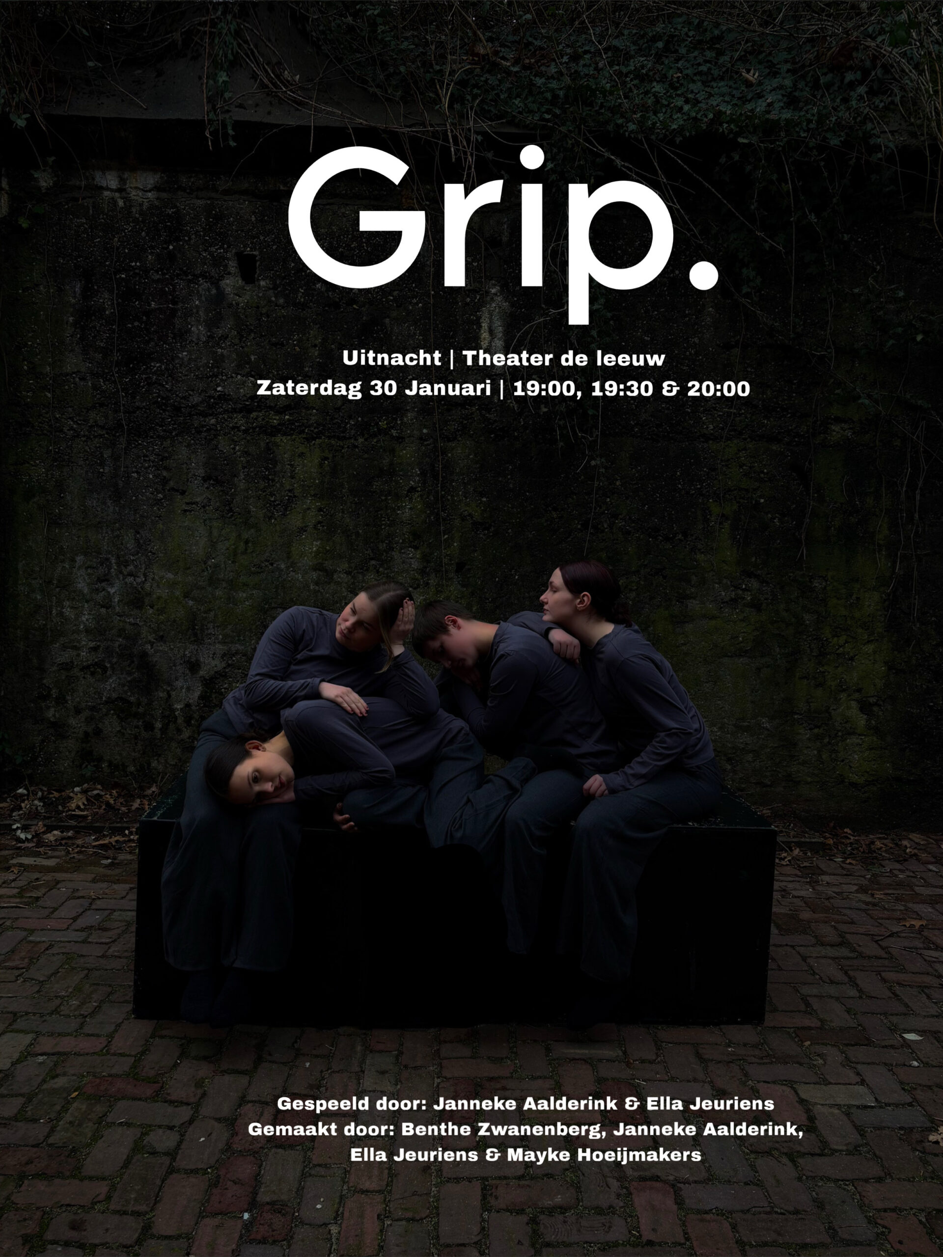 Met de voorstelling Grip brengen twee jonge spelers een eerlijk en confronterend beeld van de wereld waarin jongvolwassenen zich vandaag de dag bevinden. Ze laten zien hoe verschillende manieren van omgaan (of juist niet omgaan) met die druk eruitzien. Een verhaal over verwachtingen, falen, slagen en alles wat daartussen zit.